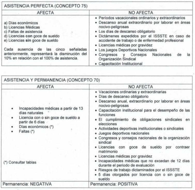 Las licencias por Incapacidad del ISSSTE, Días Económicos, faltas injustificadas, Licencias CON o Sin goce de sueldo, afectan la calificación de acuerdo a una tabla que muestra la deducción en porcentaje de dicho estimulo.